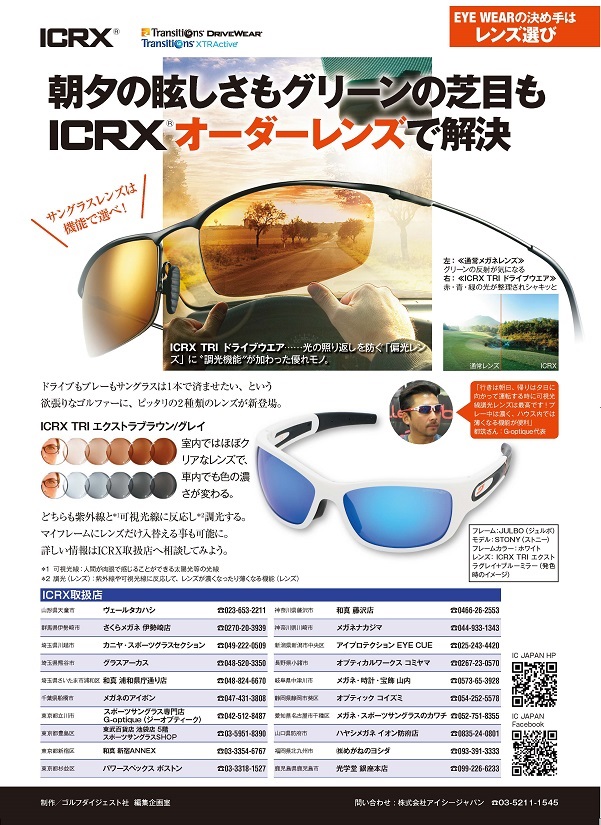 今回は「ボールの見え方が格段に良くなる”ICRXレンズ”を装用したご夫婦がテニスを楽しむ!」がテーマです。視認率が50%向上する(ウェストミンスター大学比較試験による)『機能性』(PLUS55)と『可視光線調光レンズの利便性』(エクストラアクティブ・グレイ)に『ブルー・ミラーコート』のファッション性を訴求する内容です。