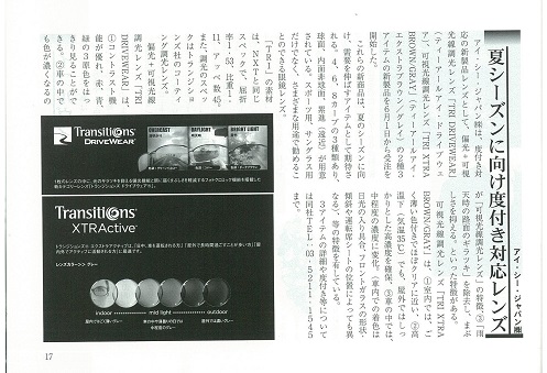 メガネ業界誌 『THE EYES 』2016年7月号 P.17に、当社新製品レンズ2種3アイテム「ICRX TRI DRIVEWEAR:ドライブウェア=偏光+可視光線調光レンズ」「ICRX TRI XTRA BROWN / GRAY:エクストラブラウン/グレイ=可視光線調光レンズ」が紹介されています。